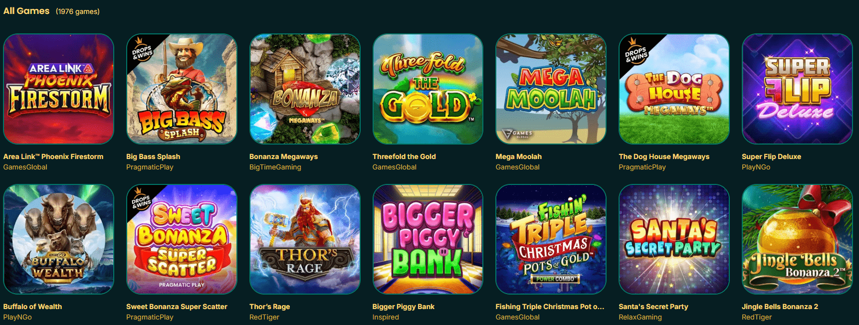 Slots: 1,400+ titles including Megaways slots, progressive jackpots, and Drops & Wins features. Popular titles include Big Bass Splash, Sugar Rush, Gonzo’s Quest, Book of Dead, and Buffalo King Megaways.