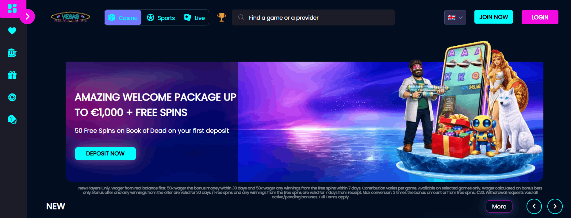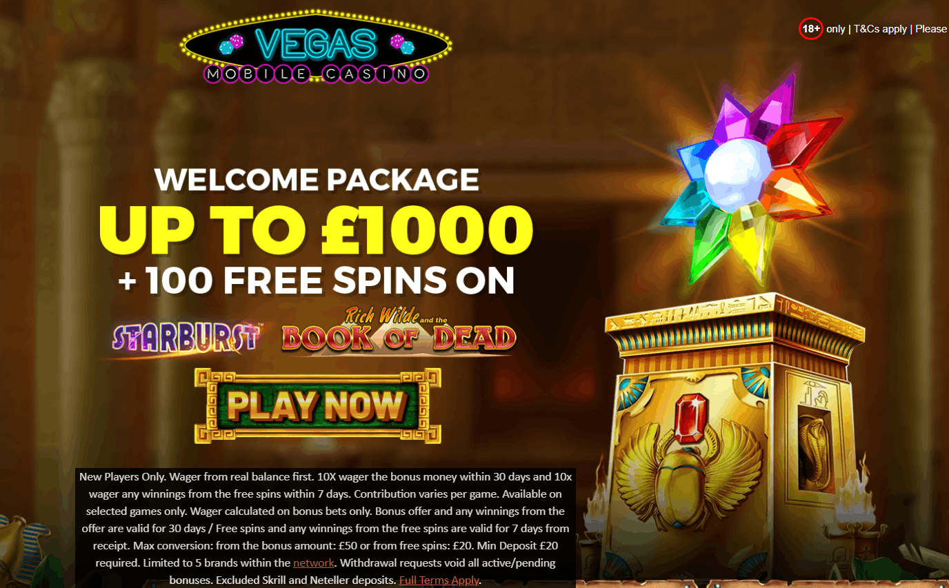 Vegas Mobile Casino offers a welcome package of up to £1,000 in bonus funds spread across the first five deposits, plus 100 free spins. The first deposit also triggers 50 free spins on Book of Dead, with a minimum deposit of £10 required at each stage.