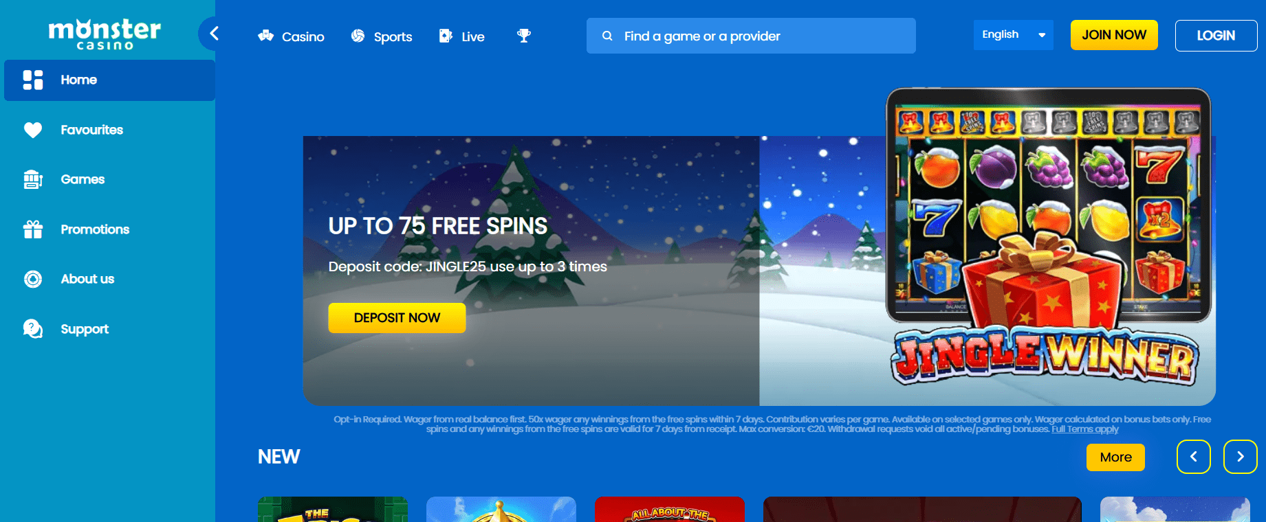 New players at Monster Casino are greeted with a substantial welcome package. According to one review, the offer can be “75% up to £1,000 + 100 free spins.”